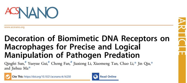 近日,365电子娱乐官方网站李超副教授、虹桥国际医学研究院的马洁桦副研究员和上海交通大学医学院附属同仁医院丘瑾主任联合在国际著名期刊《ACS Nano》上发表研究论文“Decoration of biomimetic DNA receptors on macrophages for precise and logical manipulation of pathogen predation”。作为先天免疫系统的重要组成细胞,巨噬细胞膜表面含有诸多蛋白质受体用于识别与吞噬各种病原菌。然而,经过千百万年的演化,许多病原...