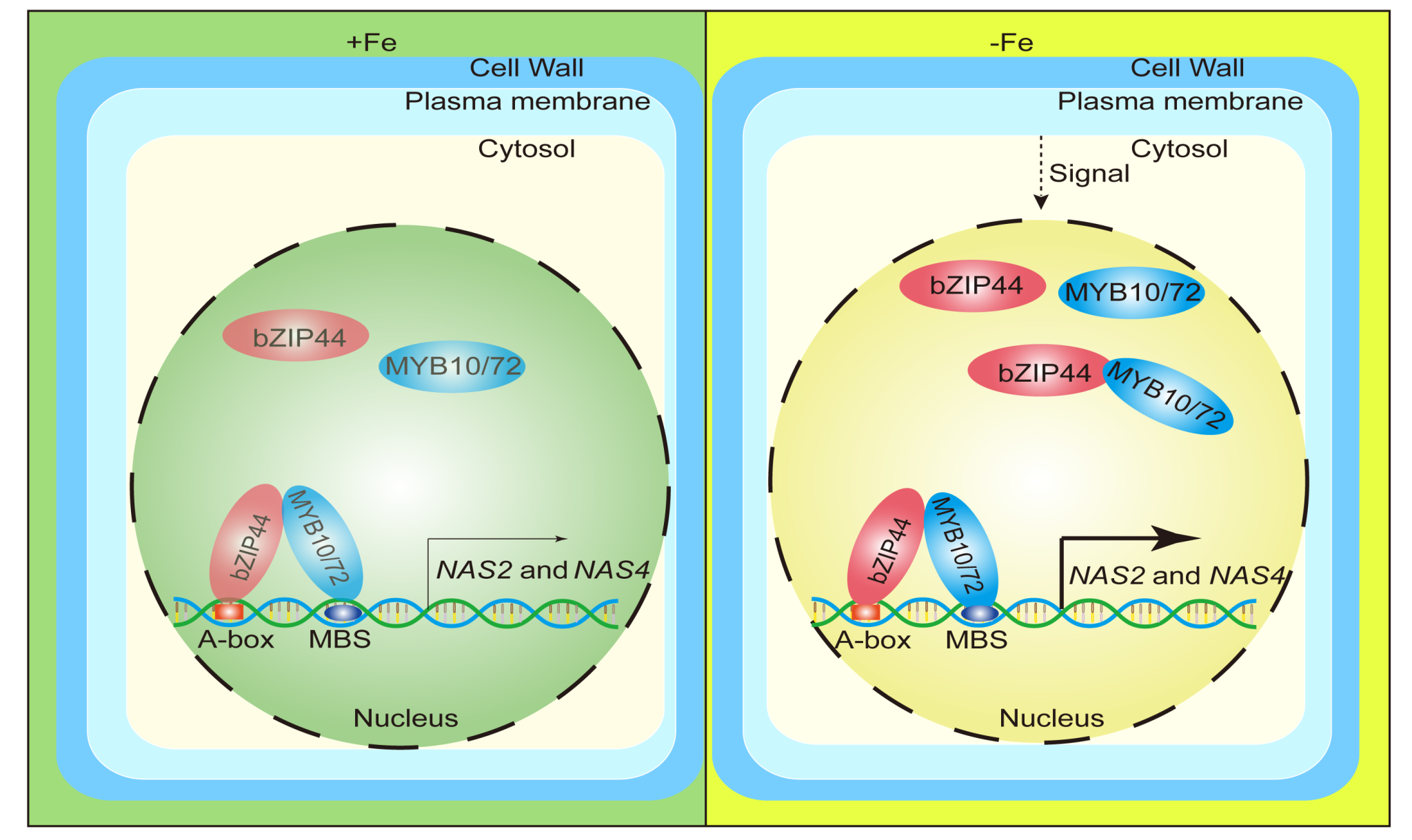 NA在植物体内铁转运方面起着重要作用。NAS控制植物体内的NA合成,拟南芥中共有四个编码NAS的基因NAS1-4。在此项研究中,作者通过分子、遗传、生理和生化等手段确定了bZIP44在介导植物对缺铁胁迫响应中的作用。缺铁胁迫诱导了bZIP44MYB10MYB72的转录活性,增强了bZIP44MYB10MYB72蛋白的相互作用,协同激活了NAS2NAS4的转录活性,促进了NA的合成,提升了铁转运,进而增强了植物对缺铁胁迫的耐受。