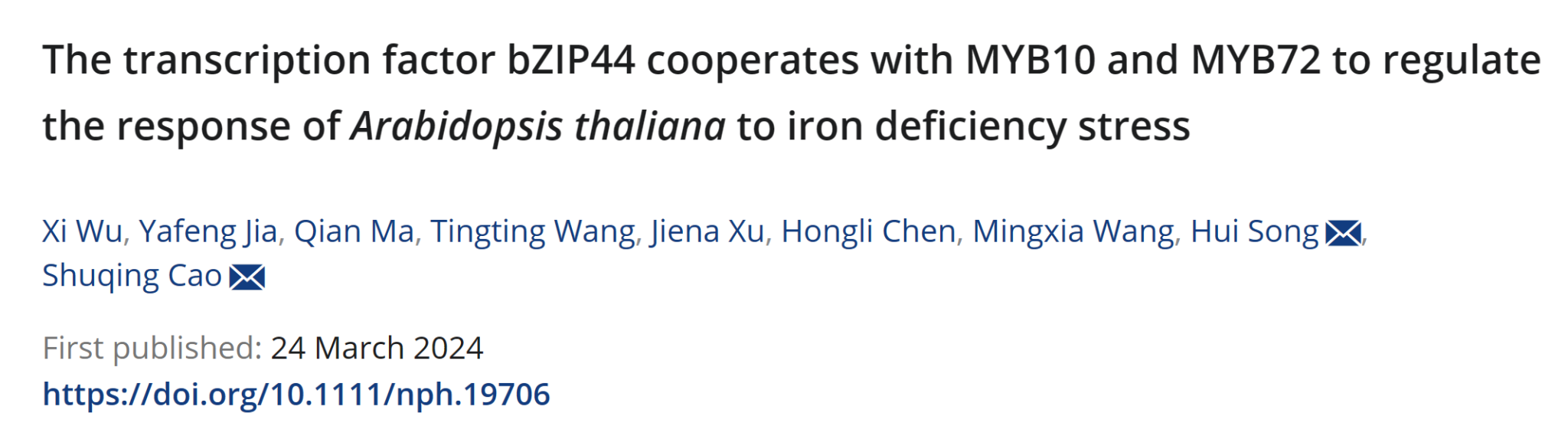 近日我院曹树青教授团队在国际著名学术期New Phytologist在线发表题为The transcription factor bZIP44 cooperates with MYB10 and MYB72 to regulate the response of Arabidopsis thaliana to iron deficiency stress的研究论文。研究揭示了转录因子bZIP44通过与MYB10MYB72互作协同调控NAS2NAS4基因的表达来参与植物对缺铁胁迫响应的调节。