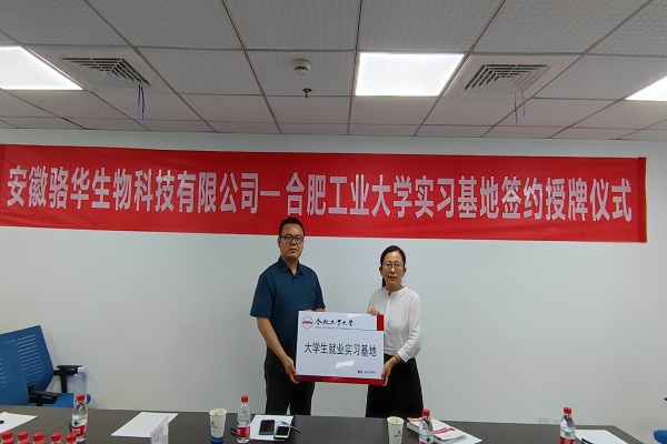 安徽骆华生物科技有限公司总经理、我校2009届生物技术专业校友苗春光对李艳一行表示热烈欢迎,他结合个人成长发展历程与在场同学们进行深入交流,并介绍了公司的研发情况;公司人力资源经理陶漫奇从公司发展历程、研发力量、技术平台、企业价值观、未来发展愿景等方面介绍了安徽骆华生物科技有限公司的概况。李艳感谢公司为学院学生提供优质的暑期实习岗位和就业机会。会上,双方举行“合肥工业大学大学生就业实习基地”协议签约及授牌仪式。