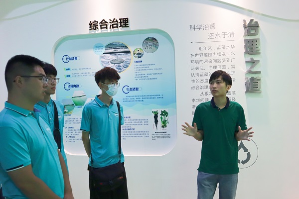 首先,实践团队来到了合肥市包河区环湖北路蓝藻科普馆,印象滨湖旅游投资发展有限公司研学导师方宇向同学们介绍了蓝藻的起源、结构、蓝藻爆发成因以及近十年蓝藻防治所取得的成果,重点讲解了通过控制外源、清除内源、生态修复等途径有效解决巢湖蓝藻问题,以及运藻船、打捞船、清水车等机械设备的工作原理。参观结束后,实践团队前往停靠在方兴湖边的城市水体蓝藻快速净化设备车进一步了解藻水分离的过程,并与负责人详细交流设备车运行状况及方兴湖蓝藻治理情况。