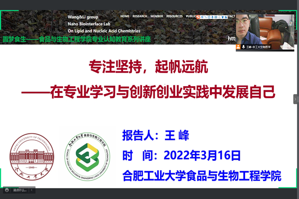 3月16日16:00,365电子娱乐官方网站“圆梦食生”第一期专业认知主题教育讲座在翡翠湖校区以腾讯会议形式举行,我院王峰教授担任主讲人,学院感兴趣的同学参加了本次讲座。