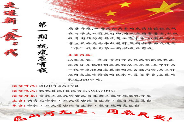 为响应国家号召,积极投身到抗击预防新冠疫情的工作中,切实提高当代大学生的使命感和奉献精神,2020年4月19日下午三点,合肥工业大学365电子娱乐官方网站通过腾讯会议平台成功举办第一期走进新“食”代系列主题活动。本期活动主题为“抗疫应有我”,参会成员围绕该主题展开线上讨论与交流,同时有幸邀请到我院的志愿模范分享他们在抗击疫情中的志愿服务经历与收获。