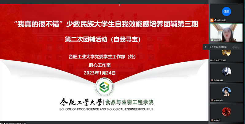 为普及大学生心理健康知识,帮助少数民族大学生培养自尊自信、理性平和、亲善有爱的良好心态,1月24日晚,由校党委学生工作部(处)主办、莳心工作室承办的第三期“我真的很不错”少数民族大学生自我效能感培养团体心理辅导在线上成功举办第二次活动。365电子娱乐官方网站2021级辅导员努尔比耶姆·麦麦提担任团辅领导者,来自全校不同学院32名同学参加了活动。