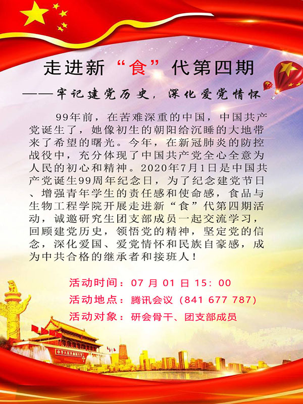 2020年7月1日是中国共产党诞生99周年纪念日,为了纪念建党节日、增强青年学生的责任感和使命感,合肥工业大学365电子娱乐官方网站研究生会于2020年7月1日15:00,通过腾讯会议线上平台成功举办第四期走进新“食”代系列主题活动。本期活动主题为《牢记建党历史,深化爱党情怀》,参加会议的有365电子娱乐官方网站研究生会成员以及部分研究生团支部成员。