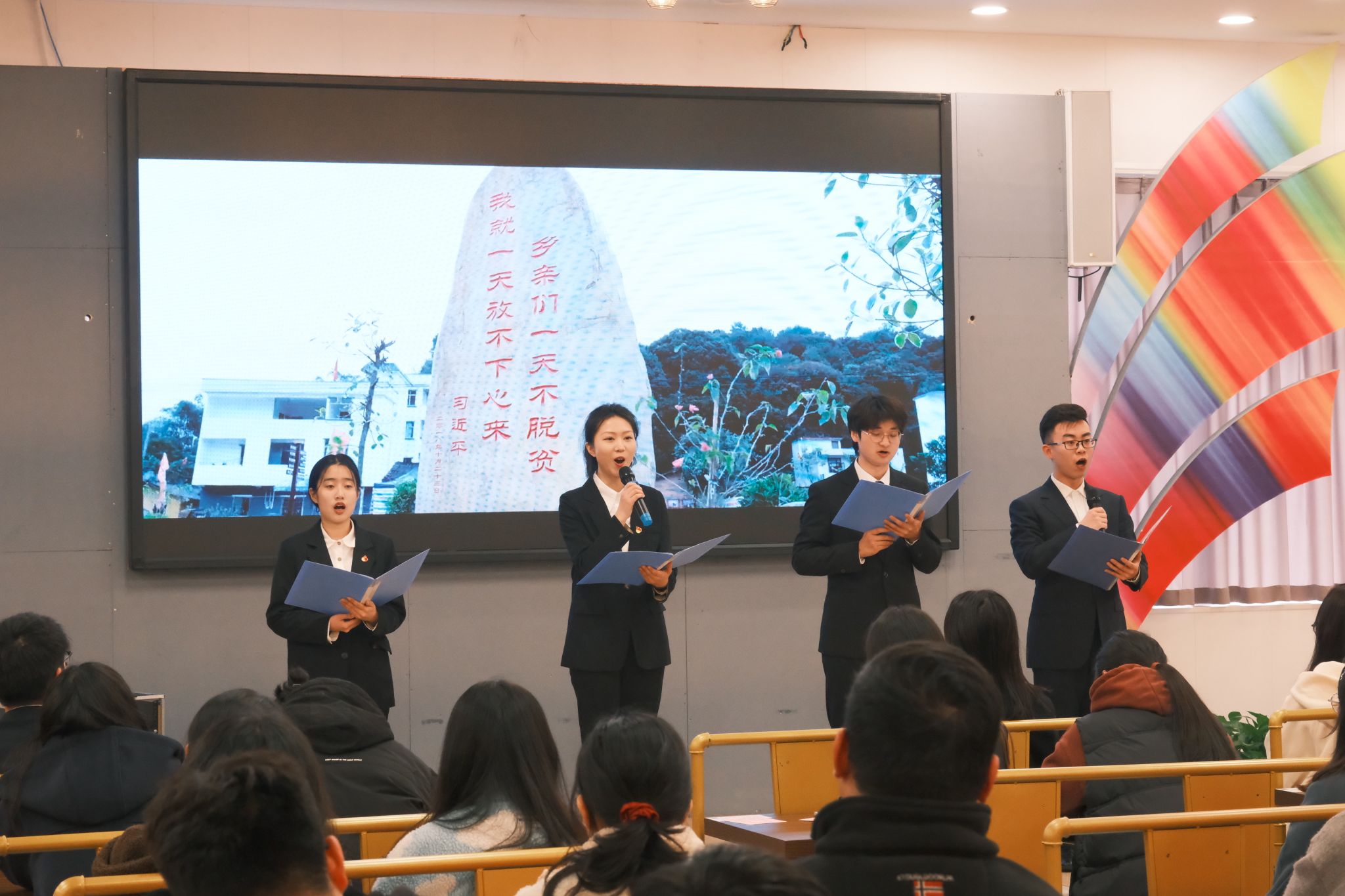 活动最后,支部党员李欣怡、梁祎楠、朱家明和董子祺为在场学生带来了诗朗诵《追梦》,铿锵有力的话语,表达了人民对美好生活的向往。