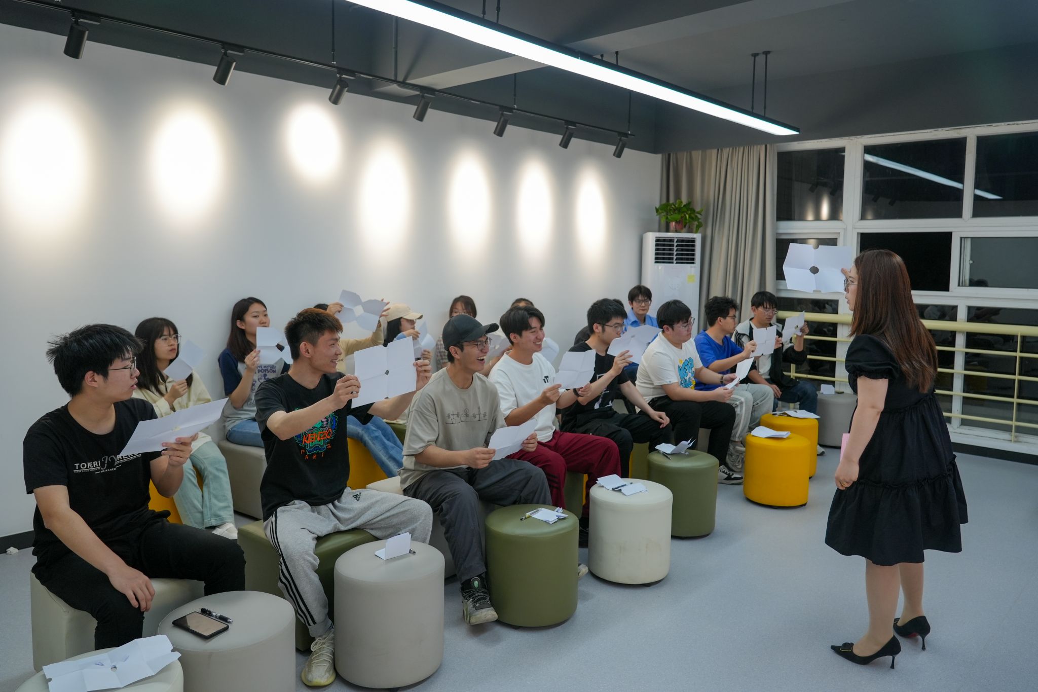 活动在热身游戏“奇怪的纸张”中正式开始。领导者下达口令,同学们根据口令进行纸张创作,创作过后以小组为单位进行作品对比分享。同学们在分享中看到了同伴创作作品的不同,意识到不同人在相同指令下做事的思路不同,完成的效果就会不同;同学们在反思中看到创作推进中缺乏沟通,创作的结果就很有可能违背指示者最初的结果设定。领导者引导大家意识到“人、事、情”在沟通中十分重要,初入职场的“职场小白”需要提升沟通意识和技巧,以此提升就业胜任力。