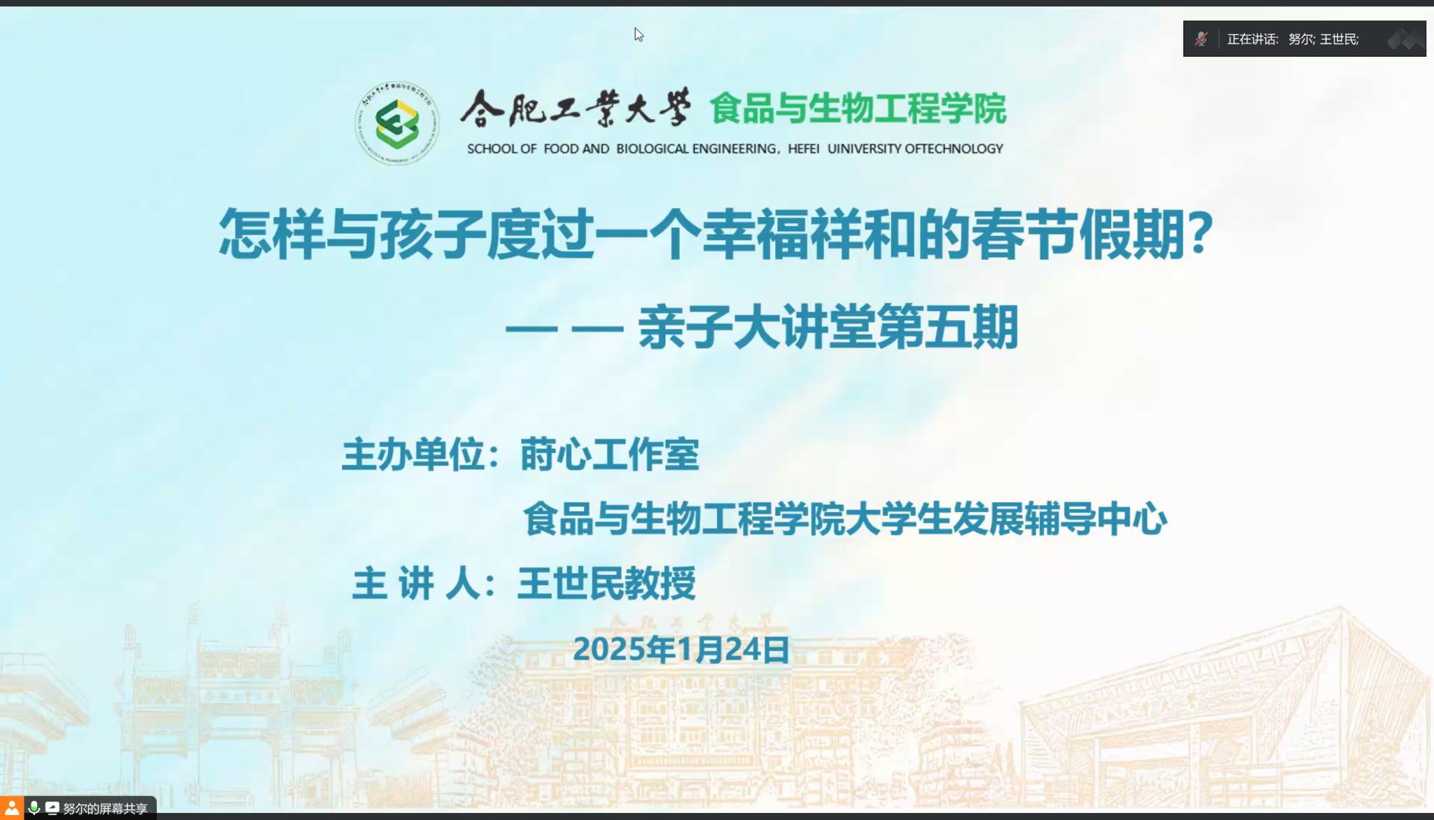 本次活动系莳心工作室精品活动之一,旨在为大学生与家人共度一个充实而有意义的假期奠定基础。此次亲子大讲堂活动为家校共育注入新动力,帮助家长们在春节假期与孩子建立更加和谐、亲密的关系,助力大学生健康成长。
