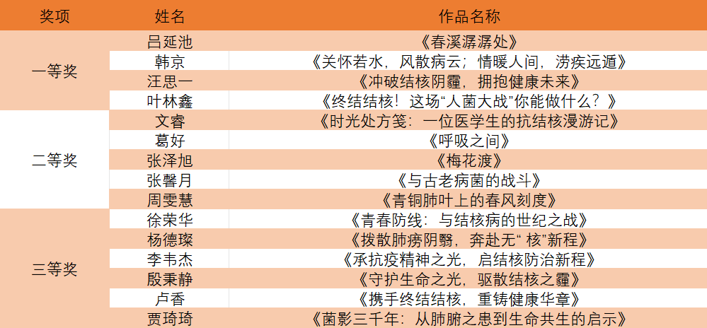 本次比赛自启动以来,受到学院学生的欢迎,参赛作品涵盖了结核病的多个方面,包括结核病的历史、现状、危害、国家政策、防治方法等。同学们通过查阅文献、深入思考和研究,用文字的方式展现了对结核病防治的深刻理解和独到见解,也体现了对社会问题的关注。最终,经过严格评选,评选出一等奖4名,二等奖5名,三等奖6名。
