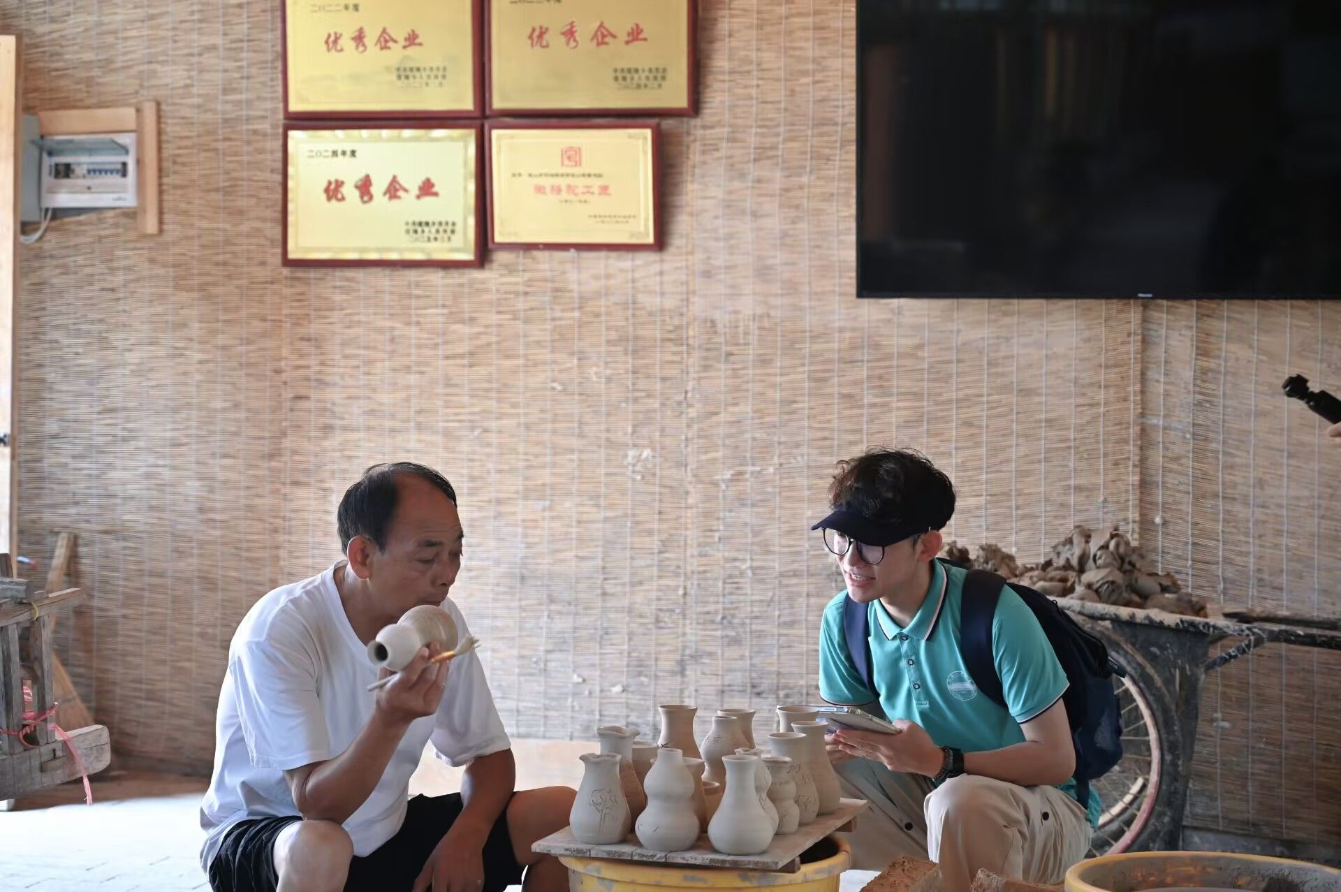 体验陶艺的同时,团队对痘姆古陶代表性传承人黄成红和涂胜友师傅进行了采访。当问及为何选择成为古陶匠人,黄师傅表示这门手艺是祖辈代代相传的结晶,承载着家族记忆与文化使命,自己肩负着将其延续下去的责任。谈及陶器样式与功能的变化,黄师傅提到,过去痘姆古陶以制作大陶为主,而如今顺应时代发展与市场需求,逐渐转向小陶制作,将非遗展厅打造成集体验、研学于一体的文化空间。在谈到手艺传承现状时,黄师傅坦言,当下愿意潜心学习这门手艺的年轻人较少,不过令人欣慰的是,越来越多小朋友走进非遗展厅体验陶艺,为古陶技艺的传承带来新希望。