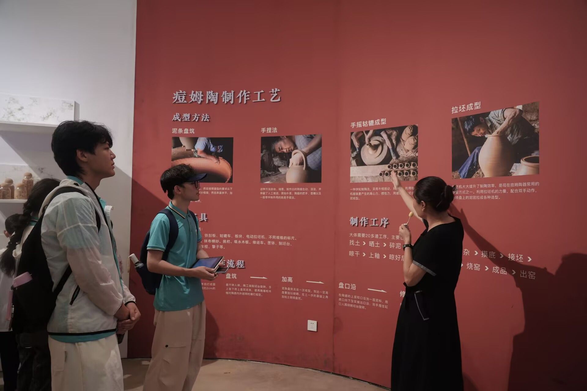 离开地质文化村,团队前往痘姆陶非物质文化遗产区域,“窑望世界,陶礼天下”的醒目标语映入眼帘,彰显着痘姆古陶走向世界的雄心与以陶为礼的文化自信。在痘姆陶非物质文化遗产展厅中,通过图文展板与实物陈列展示,成员们系统了解了痘姆古陶的发展脉络。据悉,痘姆古陶源于新石器时期,传承六千余年,其古朴原始的制作工艺被誉为"陶瓷活化石",并于2008年入选第二批国家级非物质文化遗产名录,成为潜山文化传承的璀璨明珠。