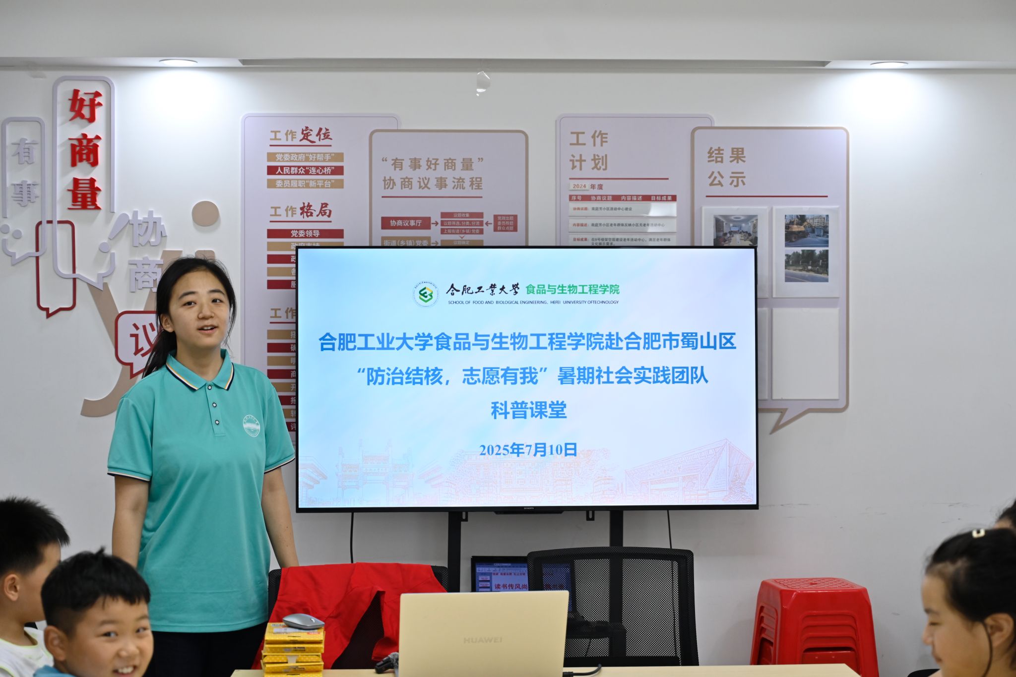为提升青少年对结核病的科学认知,增强自我防护能力,7月10日下午,合肥工业大学365电子娱乐官方网站“防治结核,志愿有我”暑期“三下乡”社会实践团队一行8人深入常青街道,开展了一场主题为“知核防核,青春同行”的青少年结核防治科普课堂。在活动现场,实践团队成员与小朋友们一起化身为“安全小卫士”,踏上了守护呼吸健康之旅。