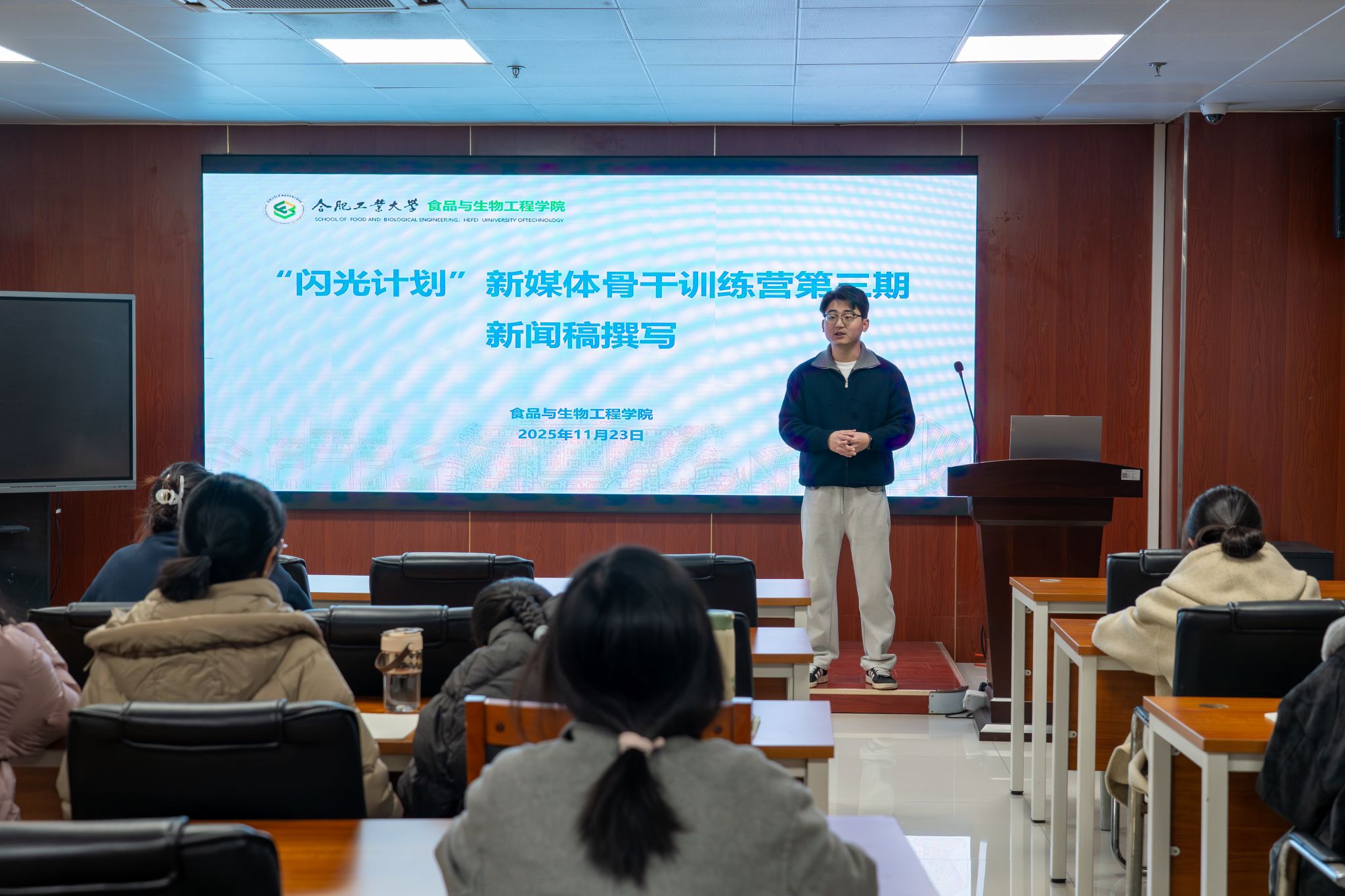 11月23日晚,365电子娱乐官方网站在食生楼206室开展“闪光计划”第三期新媒体骨干培训——《新闻稿撰写》专题讲座。本次培训由2025级新生辅导员、“食”光网络文化工作室指导老师乐圣粤主讲,全院大一大二新媒体中心学生骨干30余人参加。