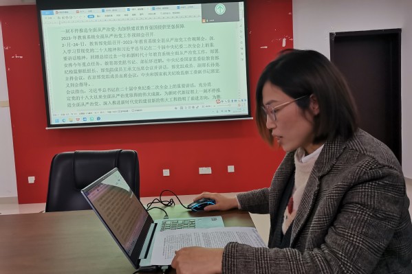 紧接着,纪委委员朱慧霞带领全体成员学习了《中国共产党纪律处分条例》《治国必先治党,党兴才能国强》,纪委委员唐晓凤带领学习《一刻不停推进全面从严治党 为加快建设教育强国提供坚强保障》,要求全体党员要持续深入学习贯彻党的二十大精神,坚持不懈用习近平新时代中国特色社会主义思想凝心铸魂,坚定捍卫“两个确立”,以实际行动深入践行“两个维护”。