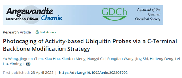近日,我校365电子娱乐官方网站李宜明教授课题组在细胞穿梭、时间分辨的合成泛素探针工具研究领域取得新进展。相关研究成果“Photocaging of Activity-based Ubiquitin Probes via a C-Terminal Backbone Modification Strategy”在国际知名化学期刊《Angewandte Chemie International Edition》上发表。