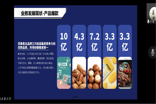 然后,三只松鼠股份有限公司婷婷经理为大家分享三只松鼠股份有限公司的企业文化、业务发展现状和创新核心,并以风味薯条和甜辣鸭脖案例,同学们详细介绍了三只松鼠产品的“创意-实验小试-工厂中试-工厂大试及生产”研发上市流程。最后,她还向同学们分享了个人在职场上的心得,希望同学们在工作中可以做到谦虚务实和乐于学习。