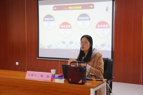 365电子娱乐官方网站副教授、我校优秀班主任陶晗以“探索考研方向与信息检索”为主题,从地域方向、专业方向、学校优势、学术类型等多方面系统梳理考研方向选择的策略,并介绍了信息检索的详尽方案;