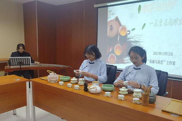 随后,工作室成员现场进行了茶艺表演示范。伴随着古筝《四段锦》的演绎,现场观众如置身在优美的山水之间,悠扬的琴声令人精神爽朗。这时,优雅的茶艺表演吸引了在场观众的目光,无论是温壶、投茶、侯汤、冲茶,还是刮沫、淋壶、烫杯、出汤、斟茶,无一不体现出中国茶道精神中的“静”和“美”。成员们悠闲围坐,品茶之清雅,听琴之音韵,分享自己的感触和心得,自然流露出浓浓温情。
