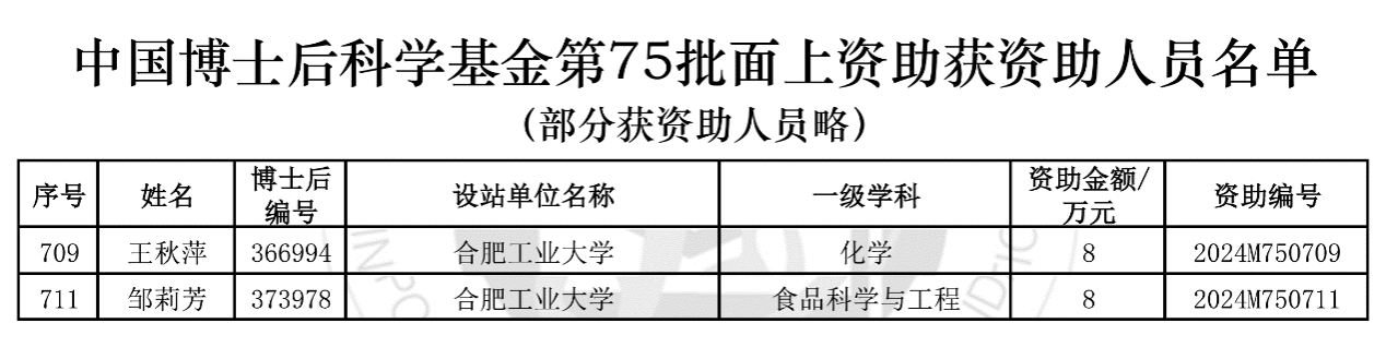 此外,中国博士后科学基金会公布了《关于公布2024年度中国博士后科学基金第75批面上资助获资助人员名单的通知》(中博基字〔2024〕11号),学院博士后王秋萍(合作导师:郑磊 教授)、邹莉芳(合作导师:徐宝才 研究员)获批中国博士后科学基金第75批面上资助。