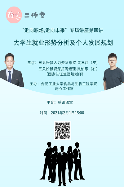 活动介绍:“走向职场、走向未来”专场讲座第五讲之“大学生就业形势分析及个人发展规划”,特邀三只松鼠股份有限公司鼠三江先生、鼠伯乐先生剖析当前形势下大学生就业形势及如何进行职业选择与探索。