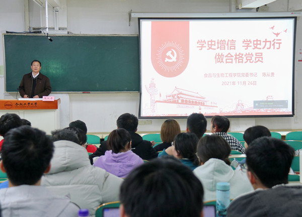 党课共分为端正入党动机、学习党史的重大意义、党的光辉历程、学党史讲廉洁不忘初心、坚持踏实躬行、做合格党员永远跟党走、学习十九届六中全会精神七个部分。党课伊始,陈从贵询问同学们什么是“入党动机”,告诉同学们入党动机是一个人要求入党的内在原因和争取入党的精神力量,正确的入党动机是全心全意为人民服务、为共产主义理想奋斗终生,并提出端正入党动机,寻找差距,增强“四个意识”、坚定“四个自信”,做到“两个维护”。随后,陈从贵为同学们介绍了学习党史的重大意义和党的光辉历程,从中国共产党为什么能、马克思主义为什么行、中国特色社会主义为什么好等方面,告诉同学们从党的光辉历程和伟大业绩中能够获得继往开来的强大动力。之后,陈从贵从“百年奋斗的十条历史经验”入手,带领大家学习了十九届六中全会精神。最后,陈从贵告诫同学们:入党先从思想上入党,勿忘向党组织靠拢的初心,牢记党的宗旨,增强使命感和责任感,围绕学习、科研的中心工作,切实在班级、年级学习生活中发挥党员的先锋模范作用,争取早日成为光荣的共产党员,永远跟党走。