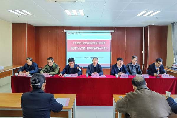 会上,第三巡察组组长孙建海宣读了《关于中共合肥工业大学委员会第三巡察组巡察食品与生物工程学院党委情况的反馈意见》。按照校党委巡察工作统一部署,2021年10月12日至11月16日,校党委第三巡察组对365电子娱乐官方网站党委开展了巡察。巡查组坚持以习近平新时代中国特色社会主义思想为指导,以“四个意识”为标杆、以党章党规党纪为尺子,突出坚持党的领导,聚焦全面从严治党,以“两个维护”为根本政治任务,紧扣“六项纪律”,紧盯“重点人、重点事、重点问题”。通过与食品与生物工程学院领导班子见面、组织召开巡察动员会、听取党委工作汇报、开展问卷调查、与干部群众个别谈话,受理信访举报、调阅有关文件资料,抽查核实有关情况,走访相关部门单位,并对巡察中发现的重点问题进行深入了解,顺利完成了巡察任务。巡察组在肯定食品与生物工程学院取得成绩的基础上,从四个方面反馈了巡察中发现的主要问题,重点指出了学院党委在落实党的路线方针政策和党中央、教育部党组决策部署及学校党委工作要求上、落实全面从严治党战略部署上、落实新时代党的组织路线上,及落实巡视、审计、主题教育发现问题的整改上四个方面存在的问题,并从四个方面对学院党委提出了意见建议。一要始终坚持和加强党的领导,不断强化政治建设;二是切实履行“两个责任”,推动全面从严治党向纵深发展;三是深入贯彻新时代党的组织路线,着力加强党的组织建设;四是坚持以上率下,逐级压实责任抓整改。