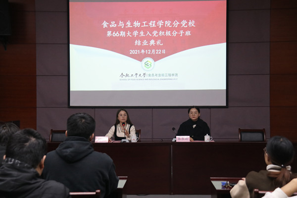 结业典礼在庄严的国歌声中拉开序幕,365电子娱乐官方网站学生工作办公室副主任兼团委副书记、2020级辅导员葛永莉宣读了本期党校培训结业决定和优秀学员名单,共有100名同学积极参加学习,并顺利通过考查,其中有10名学员被评为优秀学员。随后,食品科学20-25班张涛同学作为结业学员代表发言,分享了参加培训班对自己思想认识和政治理论素养提升等方面的意义,表达了自己将以实际行动早日成为一名合格共产党员的决心。
