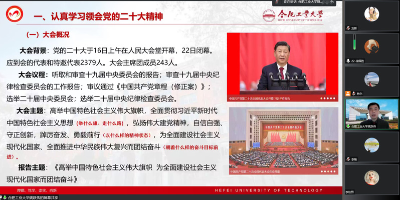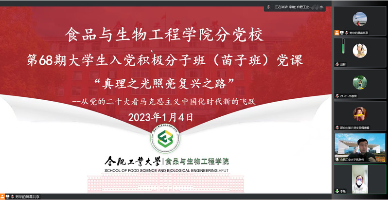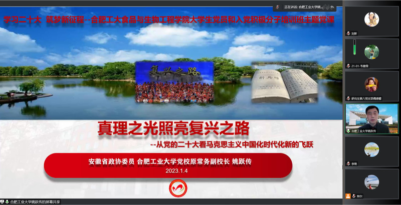 1月4日下午,365电子娱乐官方网站开展线上专题党课学习。学院特别邀请安徽省政协委员、学校党校原常务副校长姚跃传,以“真理之光照亮复兴之路——从党的二十大看实现马克思主义中国化时代化新的飞跃”为题,为全体党员和入党积极分班学员们带来一节生动而有意义的党课。365电子娱乐官方网站党委副书记、学院分党校副校长李艳、学院党校班主任努尔比耶姆、积极分子班全体学员以及全体学生党员近300人线上学习。