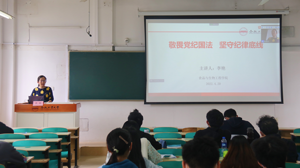 李艳以“敬畏党纪国法,坚守纪律底线”为题,从反腐败新形势,学习廉洁法律法规,增强拒腐防变能力三个方面对学员们提出遵纪守法的要求。党课伊始,李艳向同学们提问“你为何入党?”,引导大学生要树立正确的入党动机,要有全心全意为他人服务的意识、要有作为先锋模范的觉悟、要坚定从思想上入党的决心,并指出入党就意味着要拥护党的纲领和政策,全心全意为人民服务。随后,李艳指出十八大以来反腐败斗争始终保持高压势态,并对《中国共产党纪律检查委员会工作条例》及十九届中央纪委第六次全会进行了解读,告诫学员们要增强“四个意识”、坚定“四个自信”、做到“两个维护”,坚决反腐败,系好人生第一颗扣子。紧接着,李艳依次解读了《中国共产党廉洁自律准则》,《中国共产党纪律处分条例》,强调了共产党员的基本素养。她结合具体案例,联系我校疫情防控要求,提醒大家务必对自己和他人负责,带头严格遵守疫情防控政策,并要求大家以党员标准在学习、生活中处处发挥先锋模范作用。报告充分体现出理论深度、实践力度和情感温度,让全体入党积极分子班学员听得认真、学得明白,并要求入党积极分子班学员坚持以知促行,争取做讲政治有信念、讲规矩有纪律、讲道德有品行、讲奉献有作为的合格党员。最后,李艳分享了立三观,倡五讲等增强反腐败能力方法,引导各位学员不忘初心,牢记使命,坚持清正廉洁。