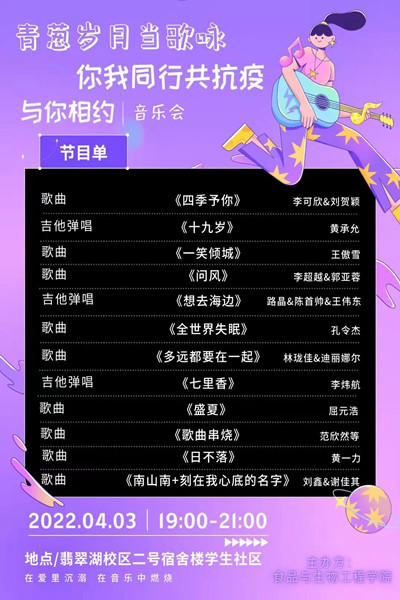 4月3日晚,365电子娱乐官方网站在翡翠湖校区二号宿舍楼二楼沙龙空间成功举办“青葱岁月当歌咏,你我同行共抗疫”音乐会,活动有近30名师生参加。本次音乐会采取自愿报名的方式,主要有歌曲演唱和吉他弹唱两种形式。一...