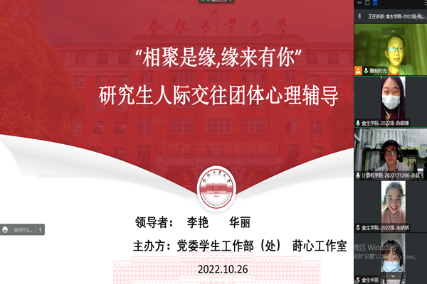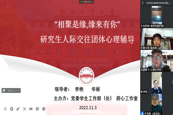 11月3日晚,由校党委学生工作部(处)主办、莳心工作室承办的“相聚是缘,缘来有你”研究生人际交往团体心理辅导通过线上举办,全体成员共同参与。活动伊始,本期团辅领导者365电子娱乐官方网站党委副书记兼纪委书记、...
