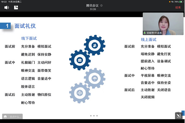 11月29日晚,365电子娱乐官方网站第二十二期“走向职场,走向未来”职商讲座顺利举行。南京诺唯赞生物科技股份有限公司HR凌晨应邀担任主讲。学院本科生、研究生通过线上的方式近100人参会。凌晨以“求职面试技巧”为主...
