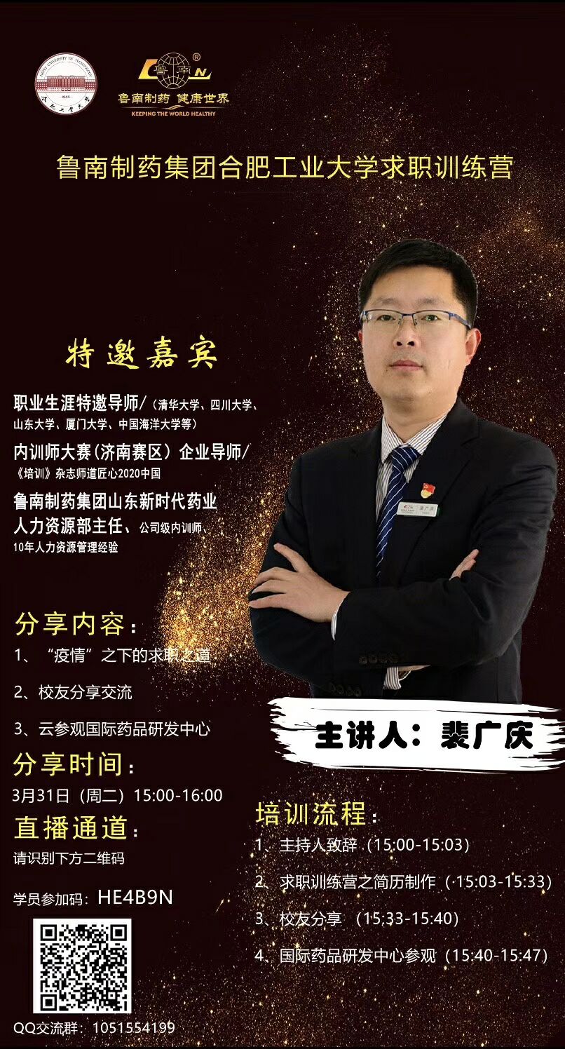 鲁南制药集团合肥工业大学求职训练营一、活动时间:3月31日15:00-15:50二、活动形式:网络授课,听课方式:扫描二维码 三、参加人员:主持人:王奇峰授课人:裴广庆校友嘉宾:王金彬学员:365电子娱乐官方网站学生四、...