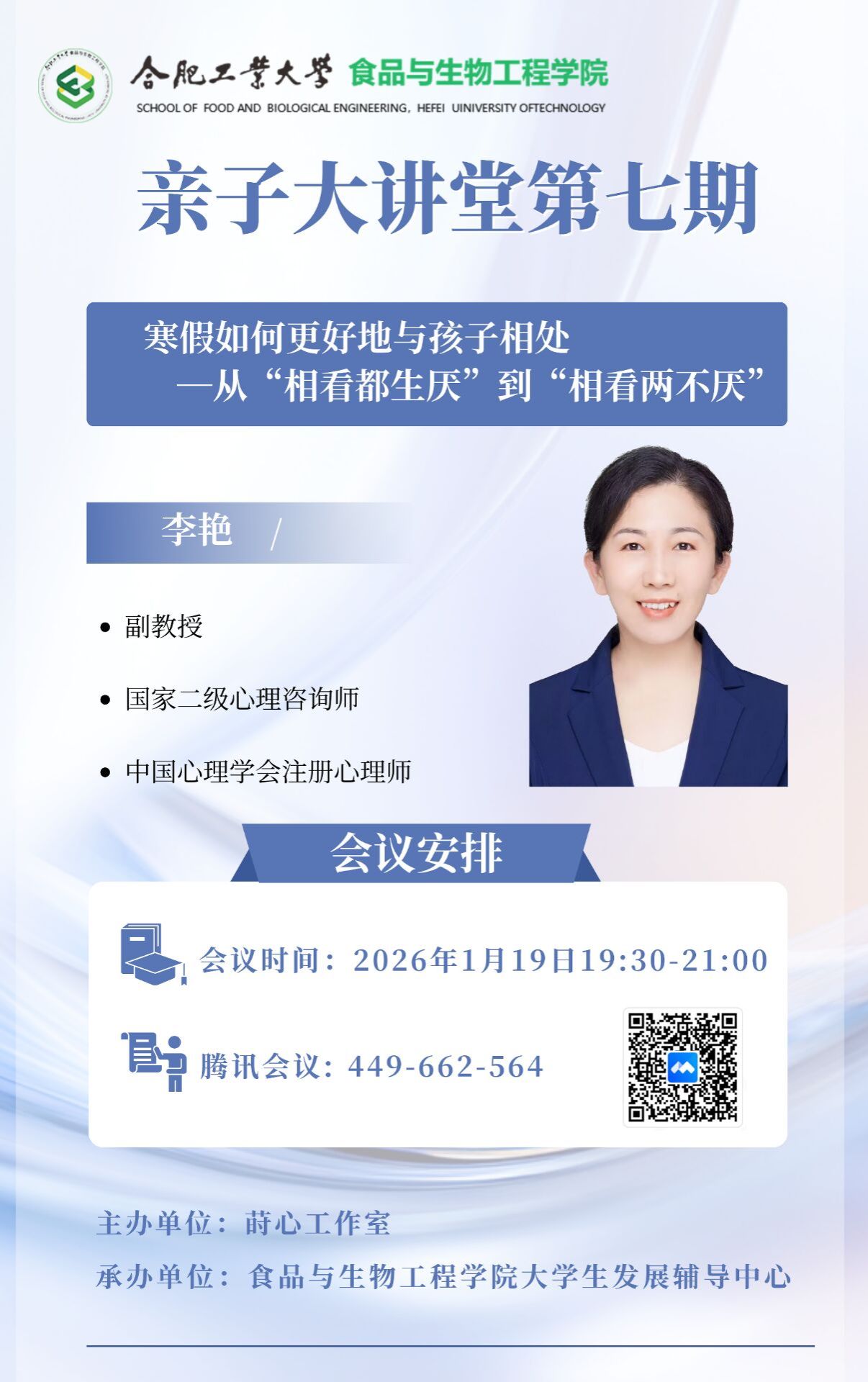 报告主题:寒假如何更好地与孩子相处——从“相看都生厌”到“相看两不厌”报告时间:2026年1月19日(星期一)19:30-21:00报告地点:腾讯会议-449662564报 告 人:李艳参与人员:学生家长举办单位:合肥工业大学365电子娱乐官方网站、莳心工作室报告人简介:李艳,副教授,国家二级心理咨询师,中国心理学会注册心理师